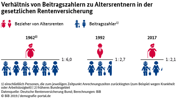 Das Verhältnis von Beitragszahlern zu Altersrentnern in der gesetzlichen Rentenversicherung wird sich weiterhin ungünstig für die Beitragszahler entwickeln. 1962, zu den Hochzeiten des Baby-Booms kamen im früheren Bundesgebiet sechs Beitragszahler auf einen Empfänger (Verhältnis 6:1). Heute ist das Verhältnis etwa 2:1, d.h. es gibt derzeit doppelt so viele Einzahler wie Empfänger. Im Jahr 2040, wenn nahezu alle Baby-Boomer aus dem Erwerbsleben ausgeschieden sind, wird das Verhältnis wohl bei 1:1,5 liegen.